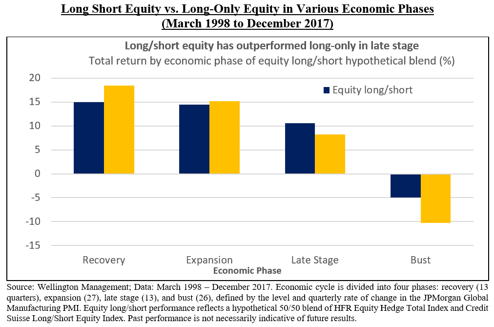 Maybe we are a little annoyed that some people view us as “wrong” about remaining bearish as the market only seems to go up. We know that we will be “right” in the long run. However, for those who are considering abandoning long/short equity, we would like to share this table recently published by Wellington Management: