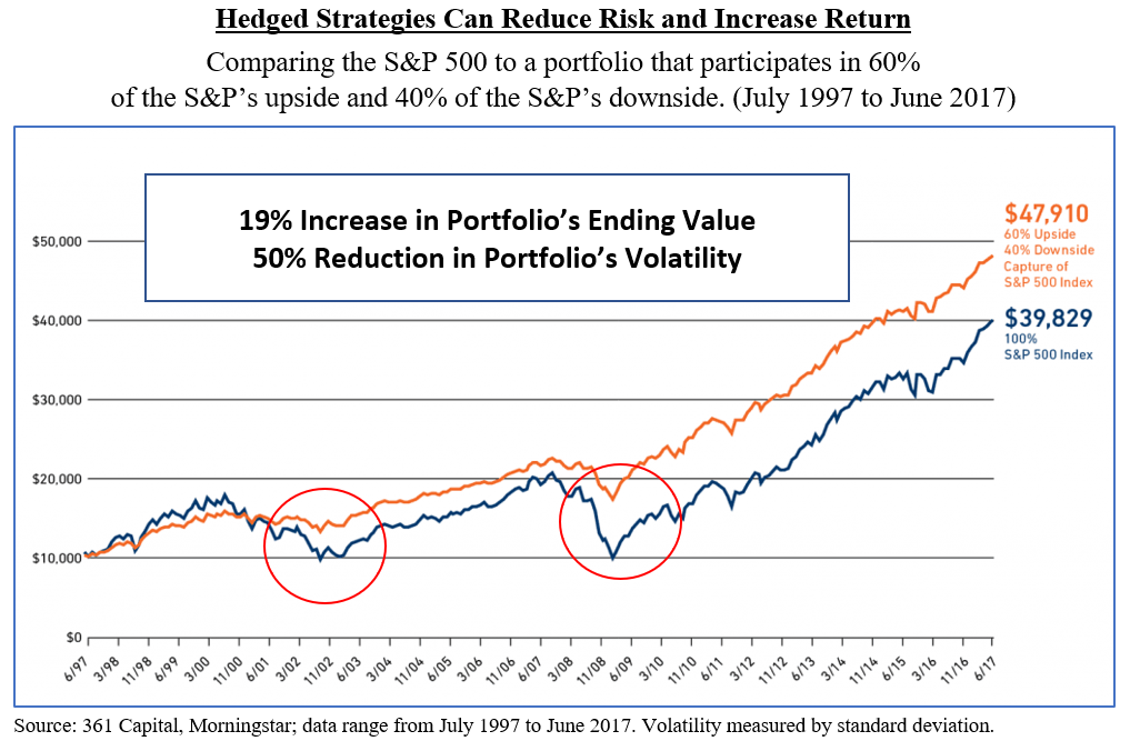 This chart demonstrates that hedged strategies provide their greatest value late in the economic cycle and through a downturn. Few would argue that we are late in the current cycle and that minimizing the risk of market losses now is as important as ever. As shown below, incorporating a truly hedged strategy can increase the portfolio’s ending value and reduce risk substantially. This is another way to look at the “power of negative numbers” (which we include with every letter) as represented by the chart above: