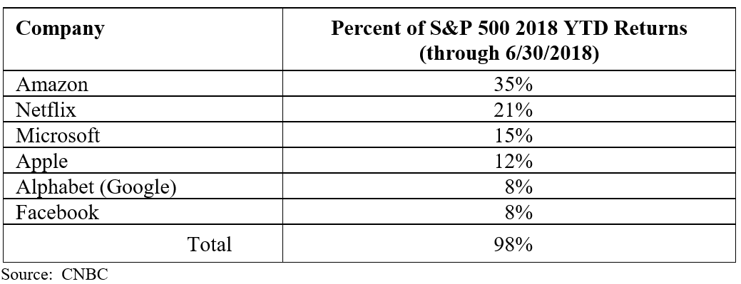 This comment from S&P Dow Jones is consistent with our view that we are living in a highly binary market environment, a view that was reinforced recently when Apple became the first company in history to cross the $1 trillion market cap threshold. To put this in perspective, that is roughly the same market cap as the country’s four major banks (Bank of America, Wells Fargo, JP Morgan, and Citigroup) combined. Yet Apple’s annual revenue of about $230 billion is less than 60% of those banks (combined of $390 billion). When we consider this in the context of how Apple, Microsoft, and their “FANG” companions (Facebook, Amazon, Netflix, and Google) drive the S&P 500 market cap and returns, we become even more concerned about valuations today and the fact that the market is increasingly lopsided. In fact, consider that those six stocks accounted for about 98% of the S&P 500 returns in the first half of 2018: