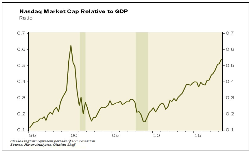 Of course, this was before Facebook hit a major air pocket on July 26th and shed approximately $100 billion in market value in one day. However, these dynamics – ballooning market caps of a small handful of companies whose performance, in turn, drives the S&P 500 returns – worry us about more widespread risks in the broader market. A related indicator is the total market cap of the NASDAQ relative to U.S. GDP. As the chart below demonstrates, this measure is approaching the bubble peak of the dotcom era: