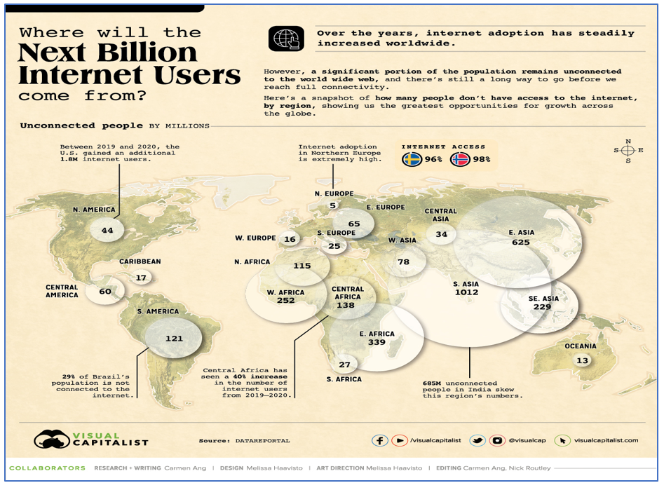 Not many people realize that over 40% of the world’s population is still not connected to the Internet. Put in more stark terms, UNICEF released a report in August that found that at least one third of the world’s schoolchildren cannot access remote learning online. Fortunately, these numbers are going down fast: according to Our World in Data, on any day in the five-year period ending in 2016, there were on average 640,000 people online for the first time. That is almost 27,000 new users every hour. When we read that the average person spends over six hours on the Internet everyday, it is fair to say that we have not yet seen the full power of the Internet and what that will bring in terms of efficiency, productivity and – let’s hope – global cooperation.