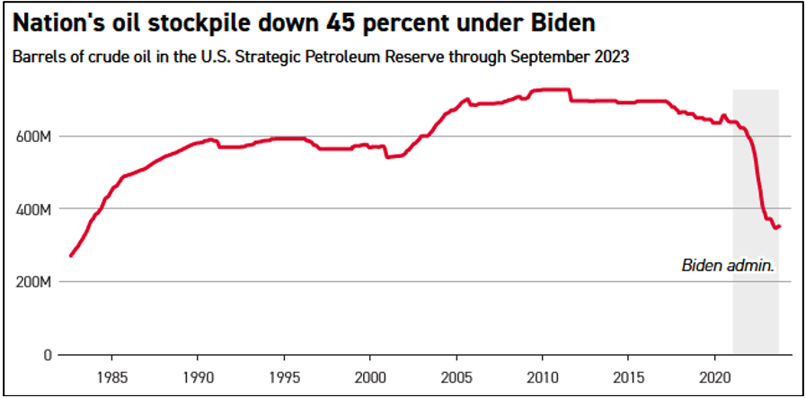 Reduced Strategic Petroleum Reserve. During his administration, President Biden has implemented one of the most aggressive drawdowns of the Strategic Petroleum Reserves in history, selling off more than 40% of the SPR. The program was first initiated in response to rising gasoline prices, and it achieved its purpose. According to the Treasury Department, Biden’s sales of oil from the reserve reduced gasoline prices by up to 40 cents per gallon. The program then was continued as a result of Russia’s invasion of Ukraine: