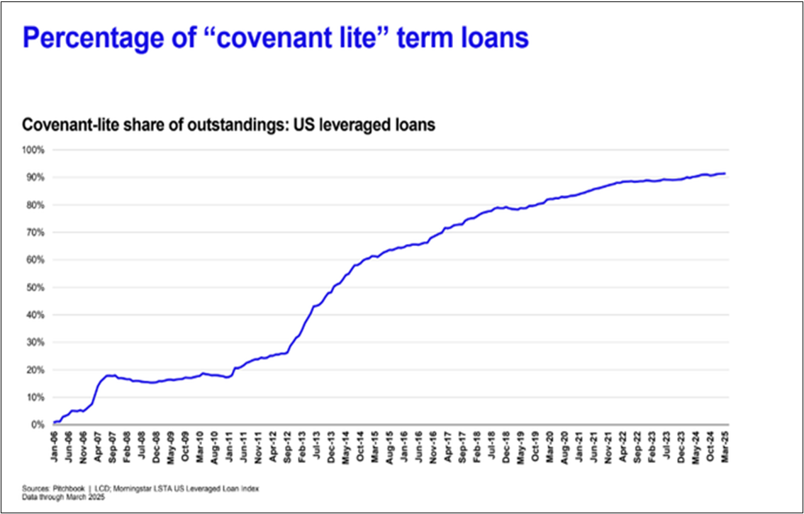 Expansion of Covenant-Lite Loans. Covenant-lite loans have significant risks because they strip away many of the traditional protections lenders typically negotiate. Unlike standard leveraged loans, cov-lite loans relax or remove maintenance covenants that require borrowers to meet ongoing financial tests, such as debt-to-EBITDA ratios. This means lenders have fewer warning signs and less control when a borrower’s financial health begins to deteriorate. While the looser terms make it easier for companies to raise debt, they can mask underlying weaknesses and increase losses in a downturn, as problems may only surface when it’s too late to intervene. For investors, cov-lite loans can offer higher yields in good times, but they magnify credit risk when markets tighten or defaults rise.