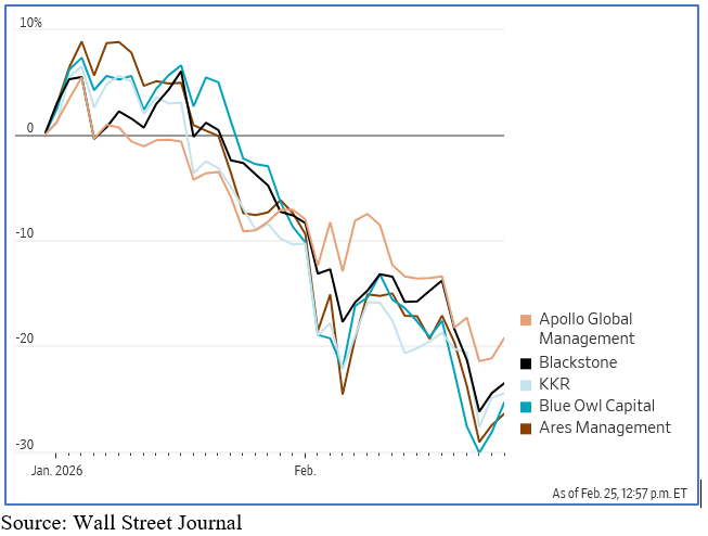 Private Credit Managers Limit Investor Redemptions. Blue Owl’s decision in February to effectively shut off regular redemptions in one of its retail-focused private credit funds and instead return capital over time through loan repayments and asset sales sent shock waves through markets. In private credit specifically, Blue Owl’s move reinforces the core tradeoff of the asset class – stable income in normal times, but limited liquidity in risk-off periods – and suggests investors may demand more transparency, tighter match-funding, and a bigger premium for locking up capital.
